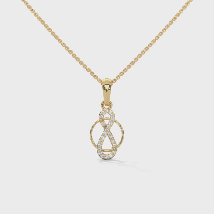 The diamonds are set using a prong/claw setting, enhancing their radiance by allowing maximum light exposure. The pendant has a total diamond weight of 0.12 CT, offering a subtle yet sophisticated glow. This pendant's graceful infinity loop design makes it a timeless and meaningful accessory, ideal for those seeking a luxurious piece that symbolizes eternity. Without Chain.
