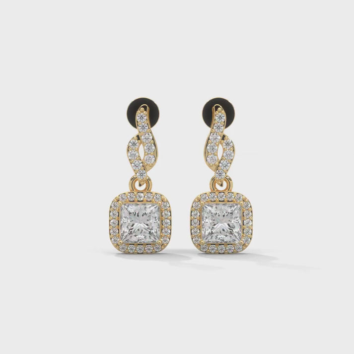 The Square Drop Earrings bring a touch of modern sophistication with their geometric elegance and dazzling brilliance. These earrings feature a combination of round and princess-cut diamonds, offering a dynamic and striking design that is both contemporary and timeless.
