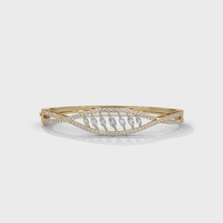 The diamonds are chosen for their exceptional clarity, with a grade of VS-SI, ensuring brilliant sparkle and brilliance. The color grade ranges from FG, representing near-colorless diamonds that shine with purity. The diamonds are cut into both round and marquise shapes, enhancing the bracelet's visual appeal with their intricate facets and smooth symmetry.